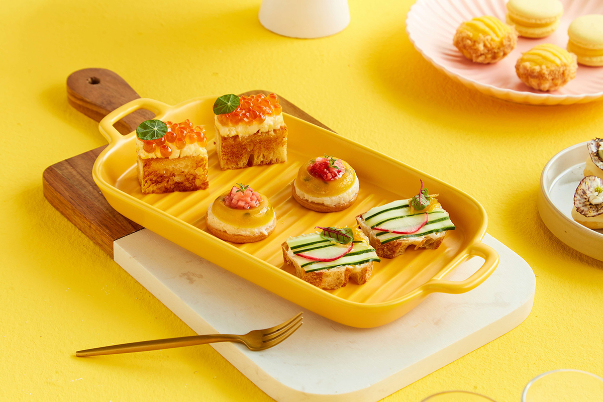 The opening selection features Truffle Egg Sandwich on Brioche and Mango & Lychee Mille-Feuille, while the mid-season menu highlights Crab Salad with Passion Fruit Gelée and White Chocolate & Yuzu Mousse. The final edition presents richer pairings such as Smoked Salmon & Lemon Crème on Mini Brioche and Mango & Passion Fruit Pavlova.