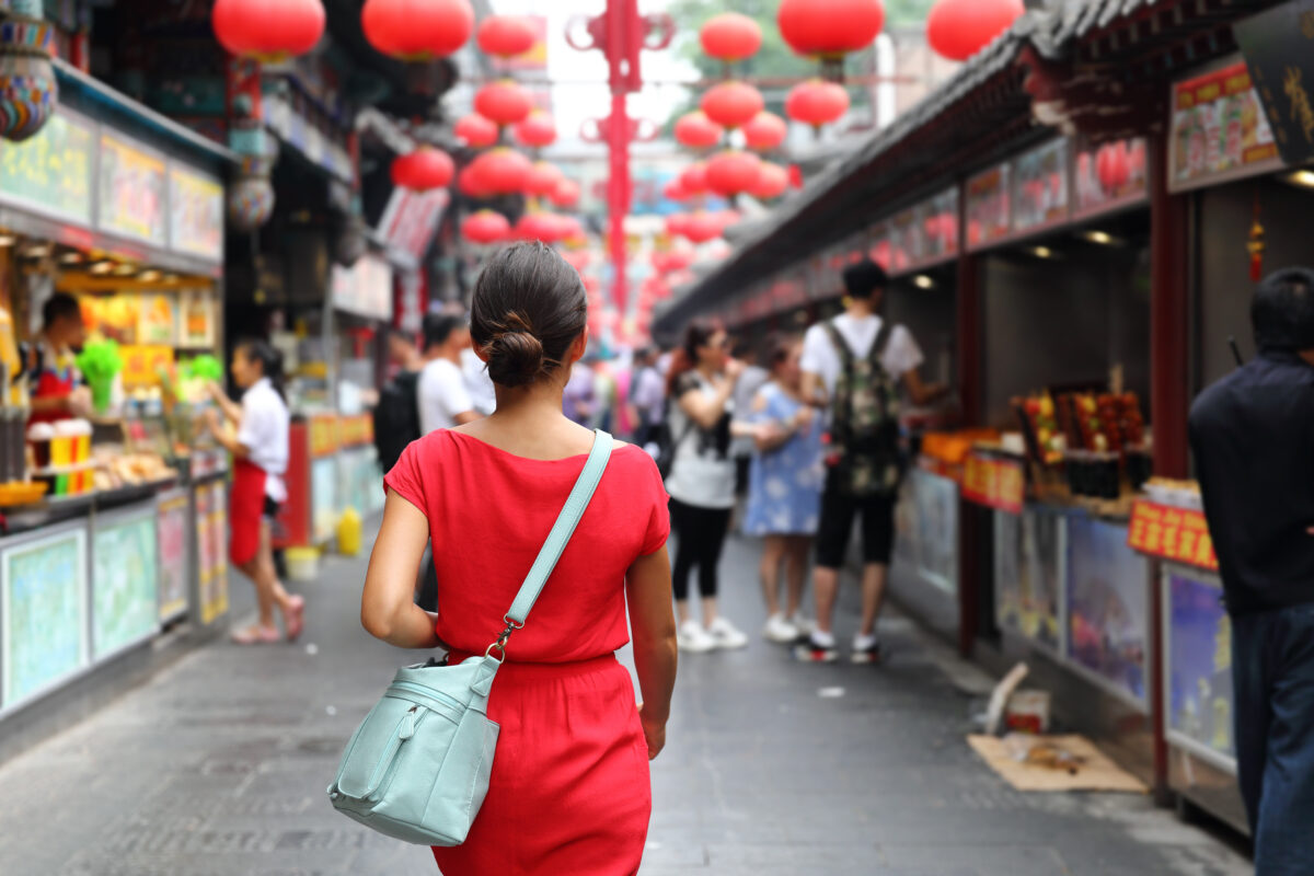 Woman,Tourist,Walking,In,Chinatown,On,China,Travel.,Asian,Girl