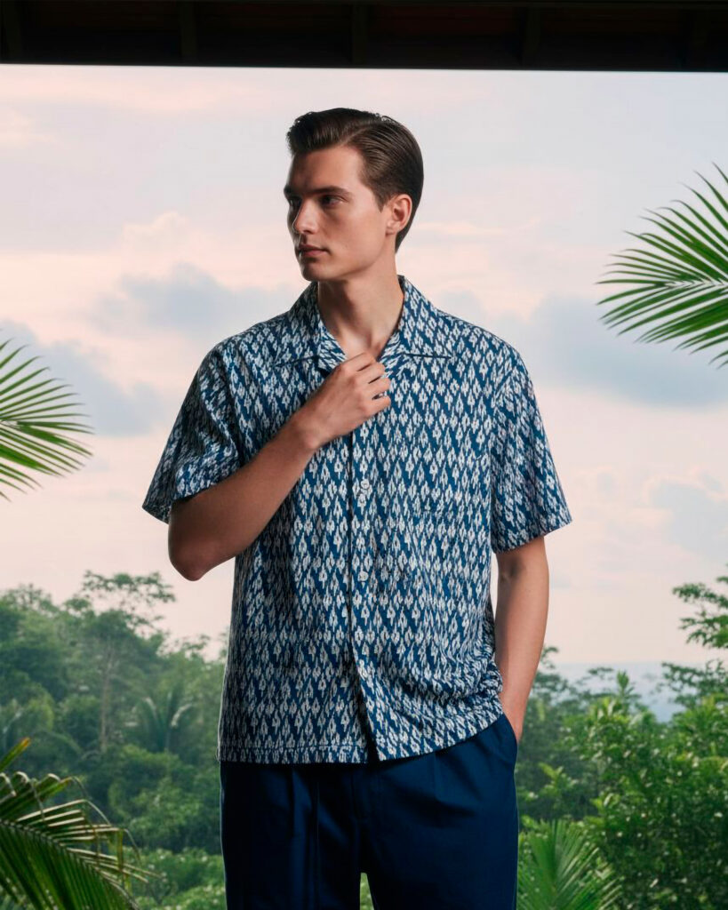 The collection draws its visual vocabulary from Chiang Mai’s mountainous districts, where ikat weaving has been handed down through generations. From the Jim’s Field of Dreams pattern series prints such as Phrao, Maechaem, Fang and Dok Kaew reinterpret traditional motifs with contemporary clarity. The patterns echo vast open skies, paddy fields, diamond weaves and the rhythmic geometry of handcrafted textiles. Styled against imagined highland vistas and lush greenery, the collection brings a fresh ease to the season, pairing artisanal detail with a relaxed, international silhouette.