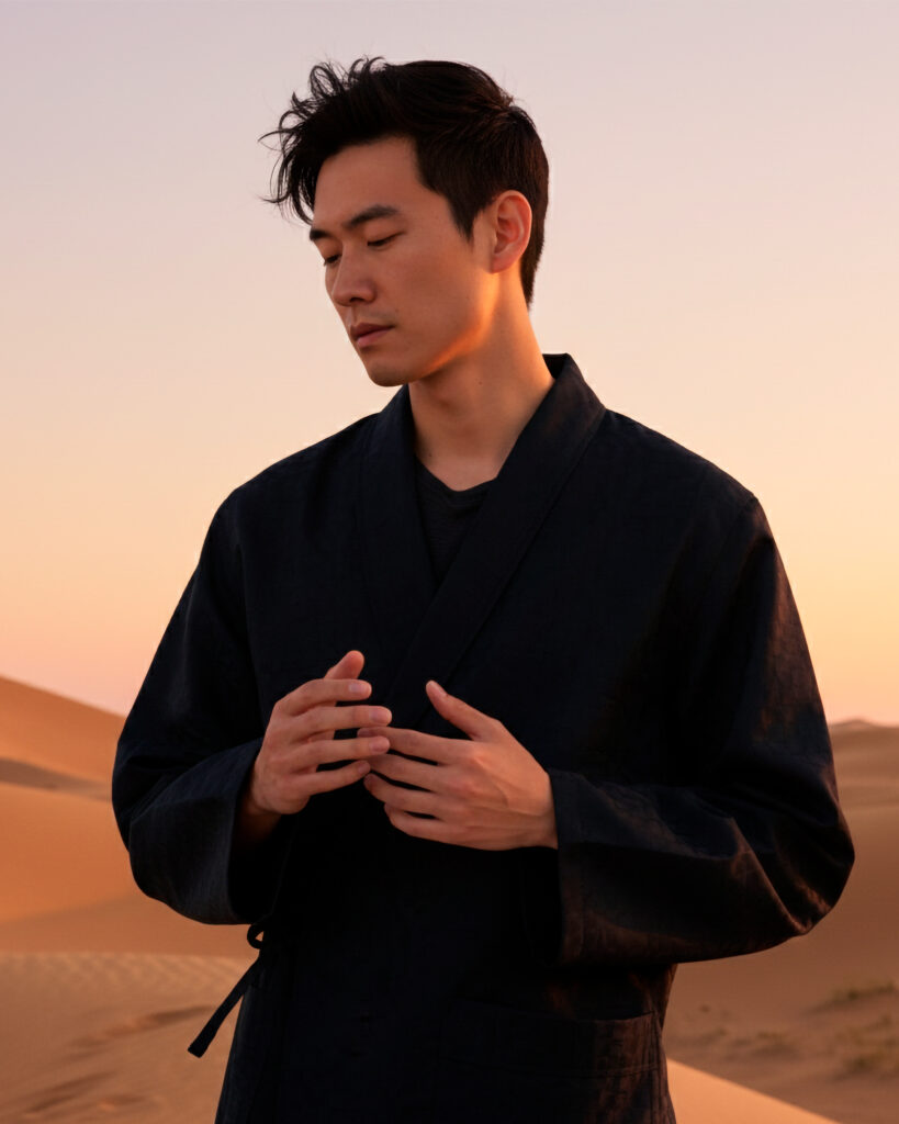 The Golden Mountain jacquard spaghetti-halter maxi dress is shown shimmering beside a tranquil pool, its metallic threads and form-fitting silhouette catching the sunrise across distant hills. Nearby, the Habotai maxi dress seems to soften into the quiet hues of a riverside at dusk, its fluid lines moving like water against fading light. The Fang silk twill midi dress, rooted in Chiang Mai’s weaving heritage, mirrors the cascading waterfall, its sculptural cut and ruffled off-shoulder detail drawing strength from the print. Menswear pieces gain new depth when placed against imagined highland horizons, with the Phrao print lending its sky-toned ikat geometry to shirts, the Maechaem pattern translating paddy field-inspired diamonds into casual trousers paired with a Dok Kaew print white-on-white woven shirt adding crisp, textural subtlety. In a contrasting imagined landscape, rolling sand dunes create a counterpoint to the measured simplicity of Jim Thompson menswear, where a dark wrap-style ensemble appears almost meditative against the stillness of the terrain. Even the Bangkok City Bag enters this dialogue, reflecting Bangkok’s shifting urban energy; it is a versatile companion for the season.