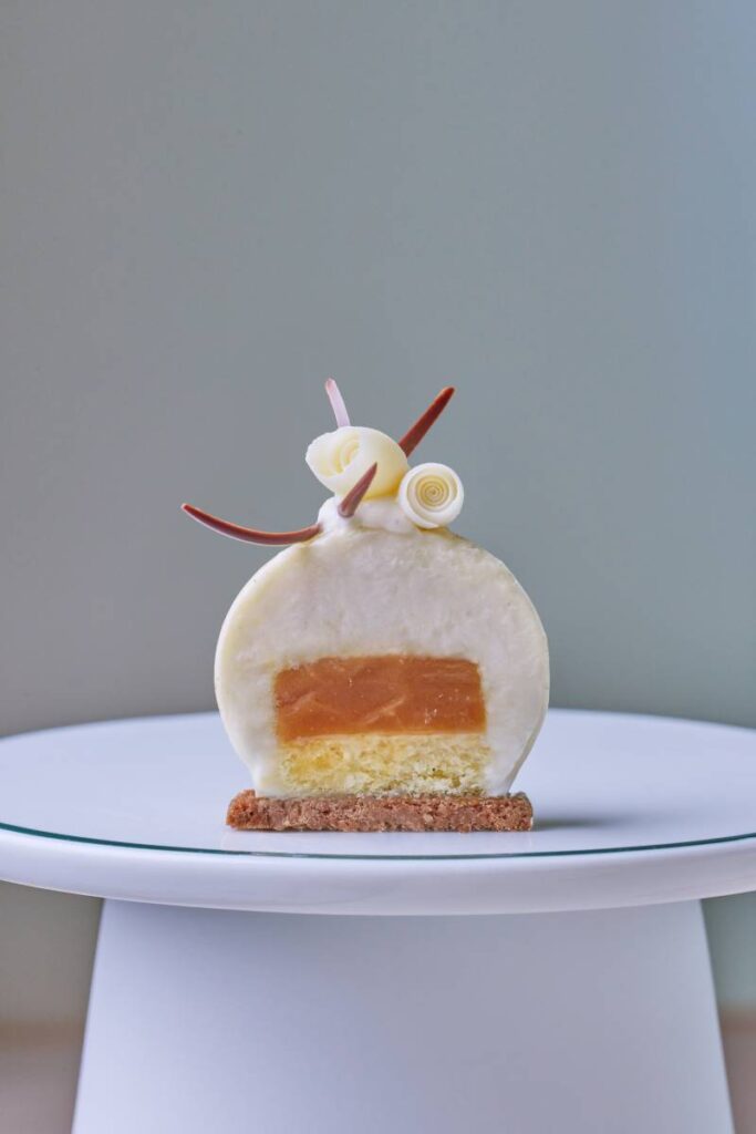 Like the first whisper of love, Vanilla Orchid captures purity and quiet promise. A smooth vanilla mousse envelops a tender madeleine sponge, hiding a molten caramel heart that melts upon tasting — a secret centre awakening within the sweetness. Resting on a crisp sablé base, its gentle transitions of texture evoke love just beginning to bloom.