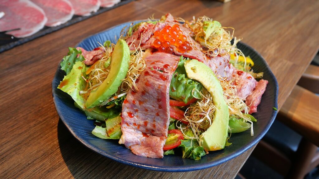 Wagyu Salad: Thinly grilled wagyu slices served with fresh vegetables and a house-made dressing that perfectly balances the richness of the meat.