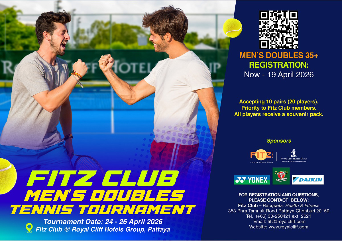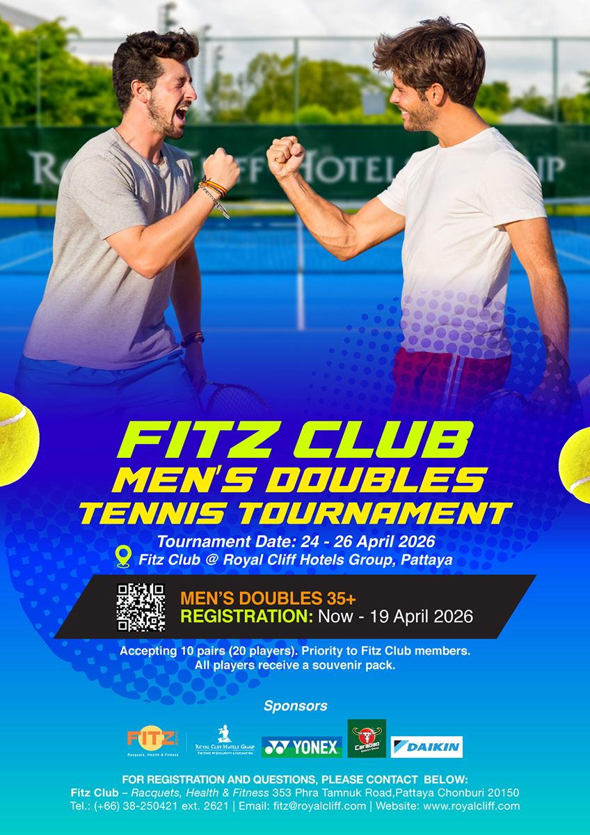 The electrifying Fitz Club Men’s Doubles Tennis Tournament returns, bringing excitement back to the courts since the first edition was held several years back. Set against the stunning backdrop of Fitz Club – Racquet, Health and Fitness in Pattaya, the tournament will take place from 24 – 26 April 2026. Open to players aged 35 and above of all skill levels, this exclusive competition is limited to just 10 pairs (20 players), ensuring an intimate yet highly competitive atmosphere. Tennis enthusiasts are encouraged to secure their place early to avoid disappointment.